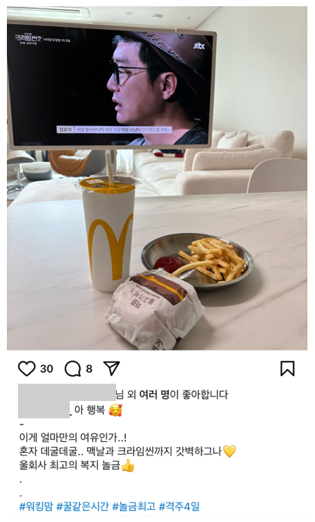 (1) 저는 두 딸이 있는 워킹맘입니다~ 아직 아이들이 어려서 휴일엔 대부분 가족과 함께 여행을 가거나 체험을 가는 등 아이들을 위한 시간을 많이 보내는데요, 놀금은 정말.. 오롯이 저 혼자만의 저를 위한 시간으로 보내고 있습니다. 아이들을 등원/등교 시키고 제일 좋아하는 정크푸드를 먹으면서(아이들과는 함께 못먹어요ㅠ) 넷플릭스 시리즈 등을 보면서 힐링타임을 갖고 있어요~