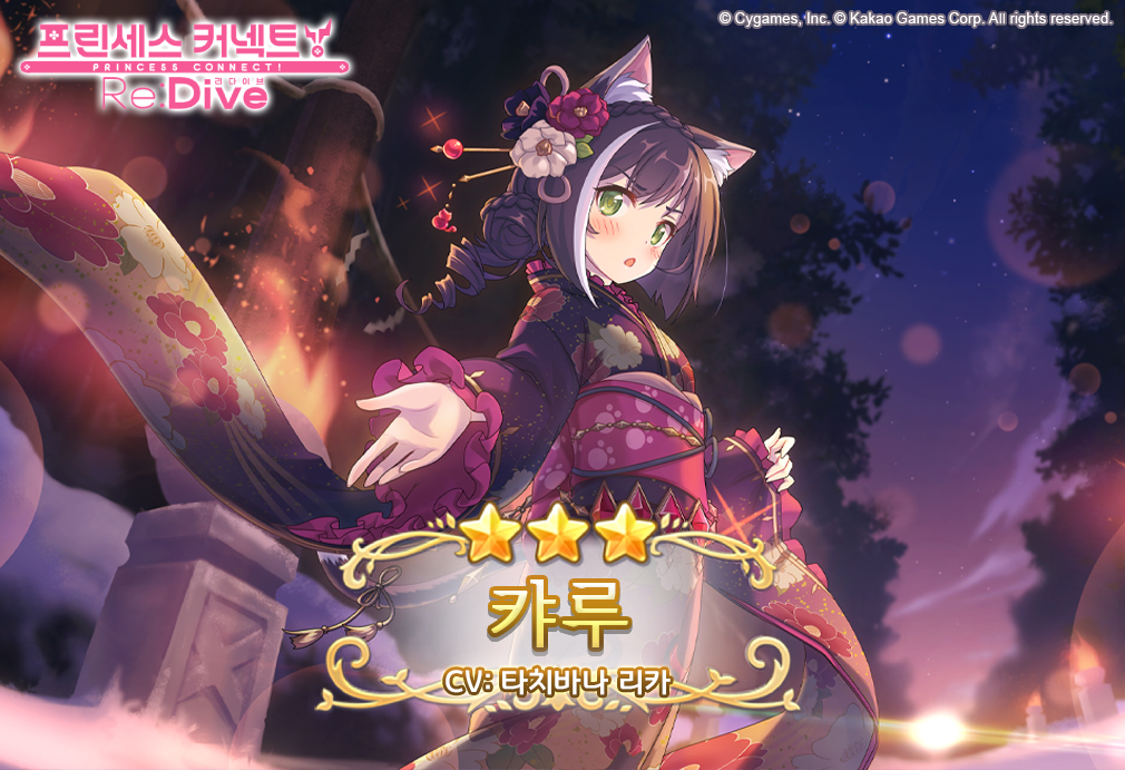 ‘프린세스 페스’와 함께 추가된 신규 한정 캐릭터 ‘캬루(새해)’는 이용자들에게 높은 사랑을 받고 있는 강력한 캐릭터로 후열에서 공격과 방어, 두 방면에서 높은 활약을 보이는 고양이 소녀다. 필살기 ‘뉴 이어 버스트’를 통해 전방의 적 하나에 강력한 마법 데미지를 입히고, 입힌 데미지량에 따라 마법 공격력을 증가시켜 지속적으로 적을 공격한다.