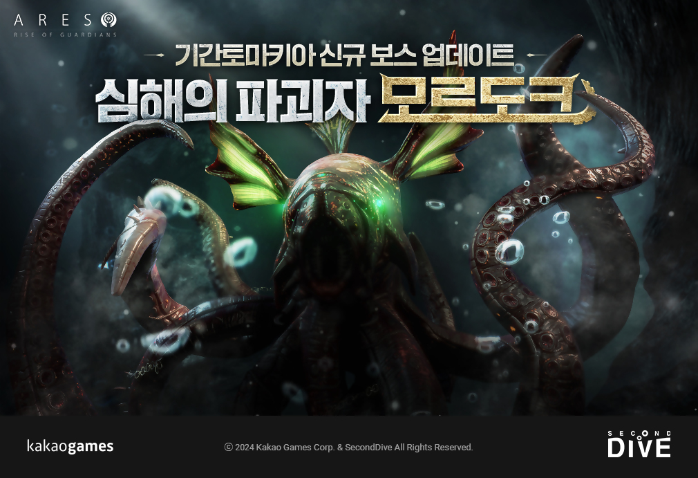 '기간토마키아'는 '아레스' 특유의 화려한 그래픽과 장대한 세계관이 돋보이는 거대 보스 사냥 협동 콘텐츠로, 이번 업데이트를 통해 '초월자 기간틱 카시아스' 이후 첫 신규 보스인 '심해의 파괴자 모르도크'가 추가됐다.