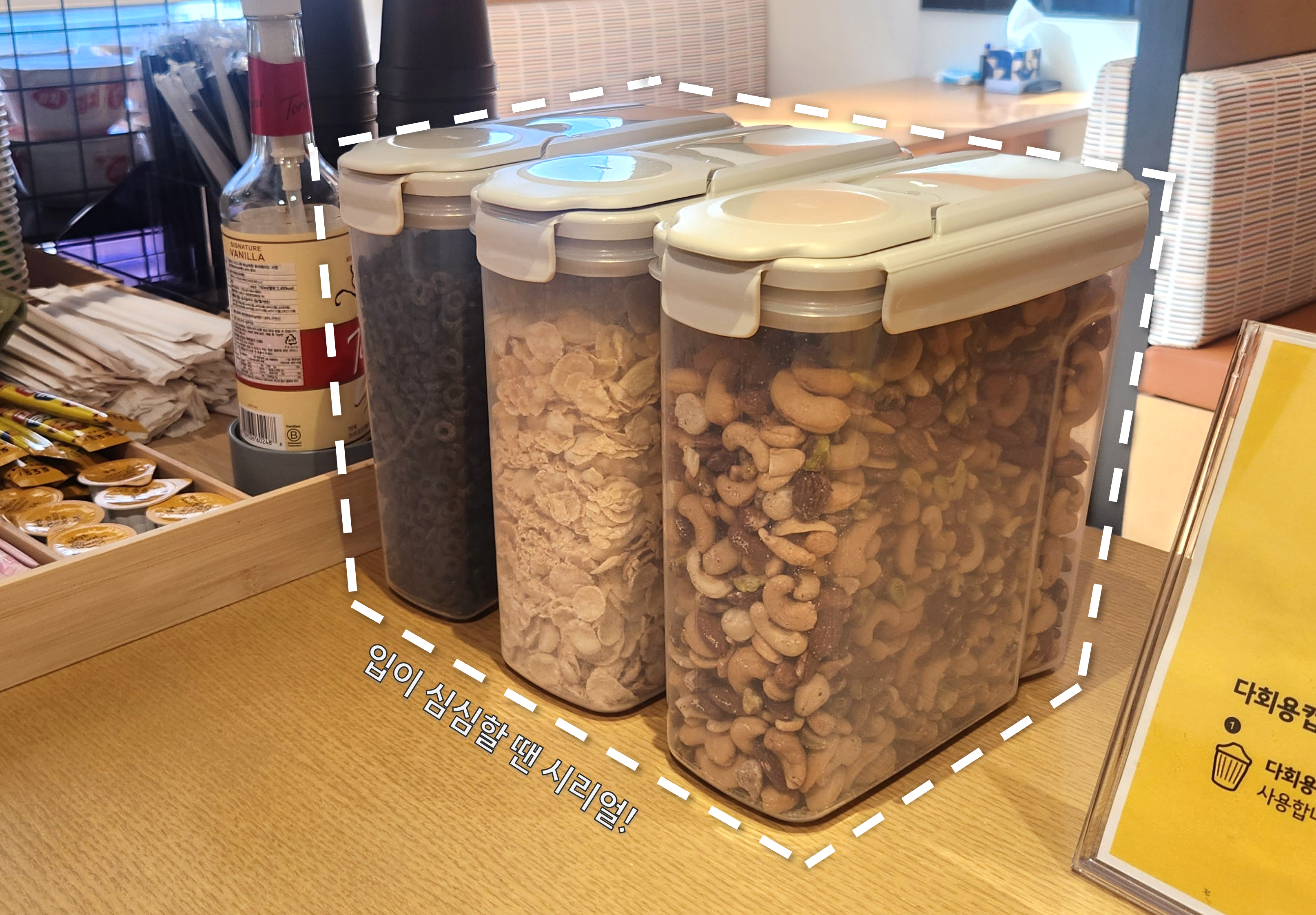 오후 4시쯤 되면 슬슬 배가 고프고, 당은 떨어지고, 입은 심심해지는 게 국룰이죠. 배고픈 크루들을 위해 다양한 음료, 간식, 컵라면 등 간식이 24시간 언제나 준비되어 있습니다. 개인적으로 선호하는 간식은 시리얼인데요! 두 가지 맛의 시리얼이 준비되어 있어 취향대로 먹을 수 있죠. (견과류를 살짝 더하면 건강을 챙겼다는 자기 합리화도 가능합니다!!)